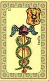 La lame du "trafic" de l'oracle Belline comporte 3 éléments : deux serpents verts, ainsi qu'un un bâton surmonté du casque ailé. Placée sous le signe de Mercure, cette lame symbolise le caducée tandis que les serpents représentent la prudence, la paix, l'éloquence, le commerce et bien entendu la médecine.