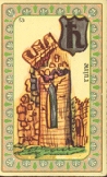 La lame "la ruine" de l'oracle Belline comporte 2 éléments : une tour ainsi que des bâtiments en ruine en arrière plan, de la verdure à ses pieds. Placée sous le signe de Saturne, elle signifie que les affres du temps ont fait leur oeuvre mais que la verdure, le renouveau, est bien présent.