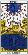 Cette lame du Tarot de Marseille comporte 5 éléments : une Lune bleue lançant des rayons bleus et rouges, 2 bâtiments à l'arrière plan, 2 chiens hurlants et une étendue d'eau d'ou transparaît une écrevisse. Cette carte symbolise l'émotivité, le doute, le mensonge mais aussi la mère.
